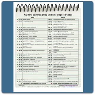 This guide clearly explains which diagnosis codes correspond to common sleep-related condtions. It offers a side-by-side comparison of sleep medicine codes in ICD9 and ICD10 to help your practice transition smoothly to ICD10 by October 1, 2015.